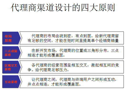 第二、三点成面原理。在新开发的市场,在经销商布局中,所选择的代理商所处的区域位置,呈三角形分布。从数学原理上来理解,三点相连,覆盖面最广,渠道结构最稳定。